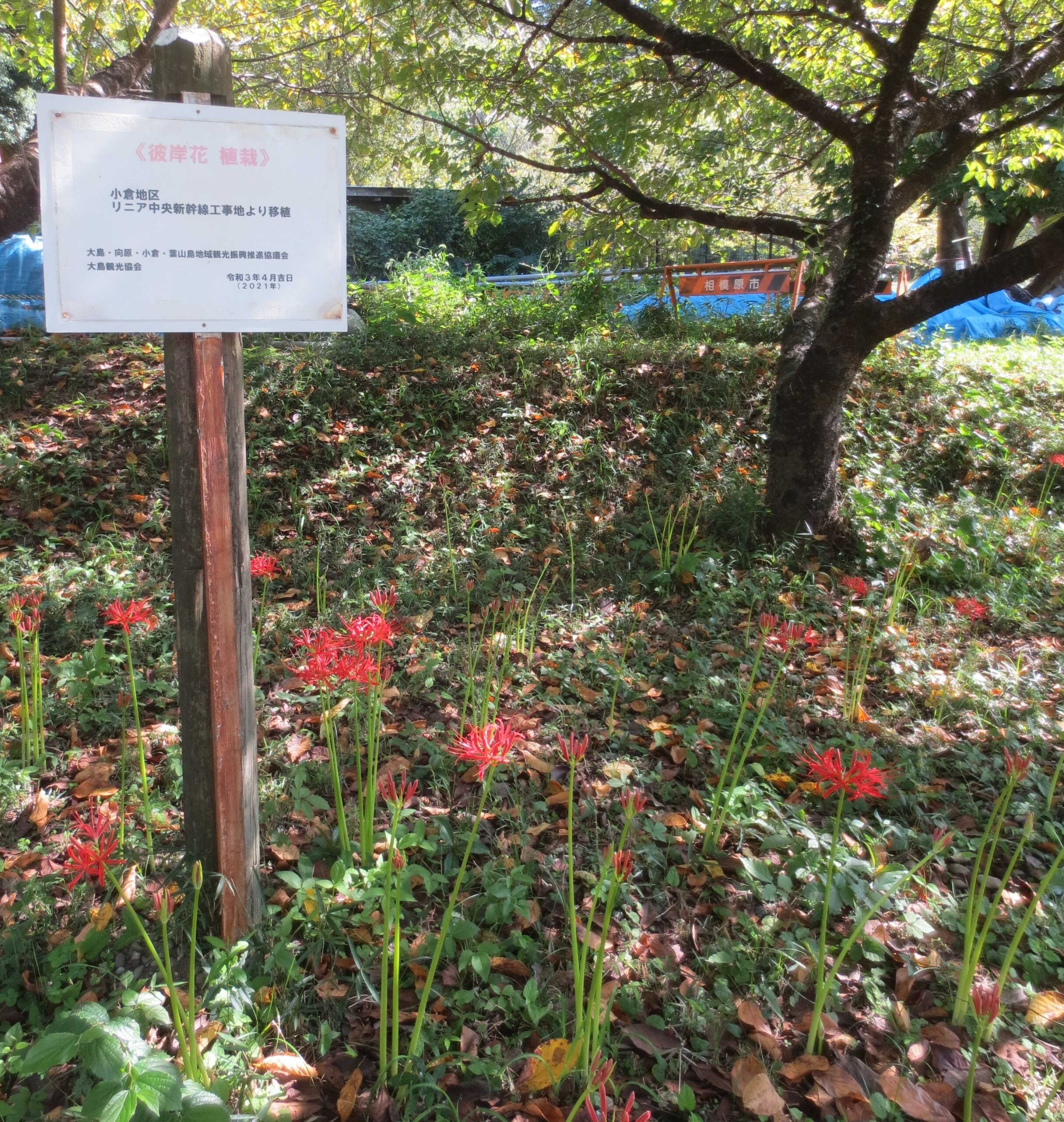 ・リニア新幹線工事現場から移植したヒガンバナが成長しています。
