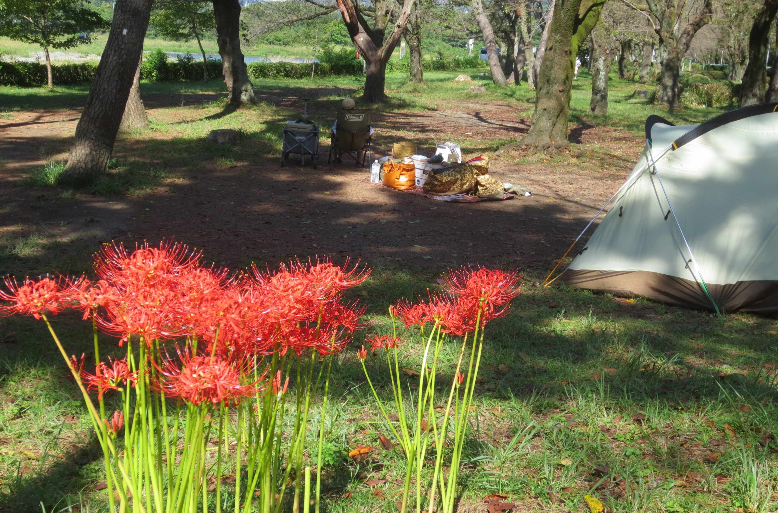 ・ソロキャンパー(中央後ろ向きに座る)に彼岸花がご挨拶